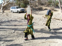 水汲みは子供の日課の一つとなっている。ポリタンクを頭に載せて水を運搬する子供たち